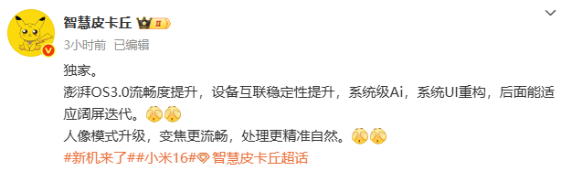 UI设计层面,澎湃OS 3将进行结构性重构,采用更现代化的视觉语言,适配未来高分辨率与设备的迭代趋势,提升多任务与分屏操作体验。此外,影像功能同步升级,人像模式算法优化,变焦过程更平滑,边缘处理与景深还原更加自然精准。